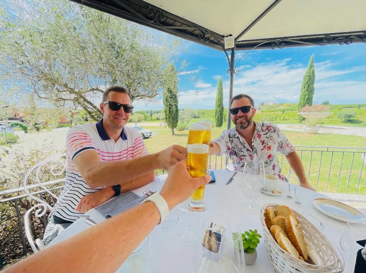 There’s a golf course somewhere in the background, the beers in our hands are pure freedom, and our biggest problem that day was deciding between another round or a nap.